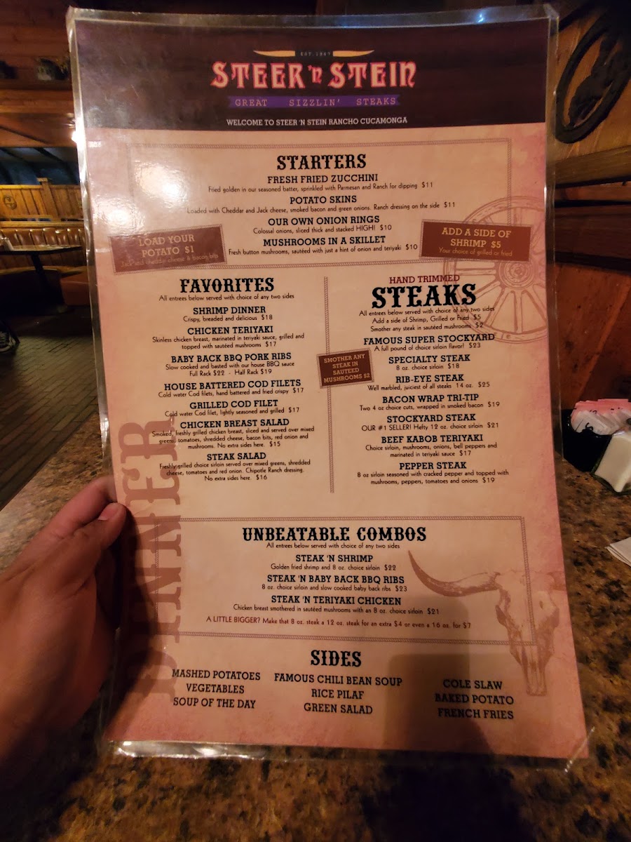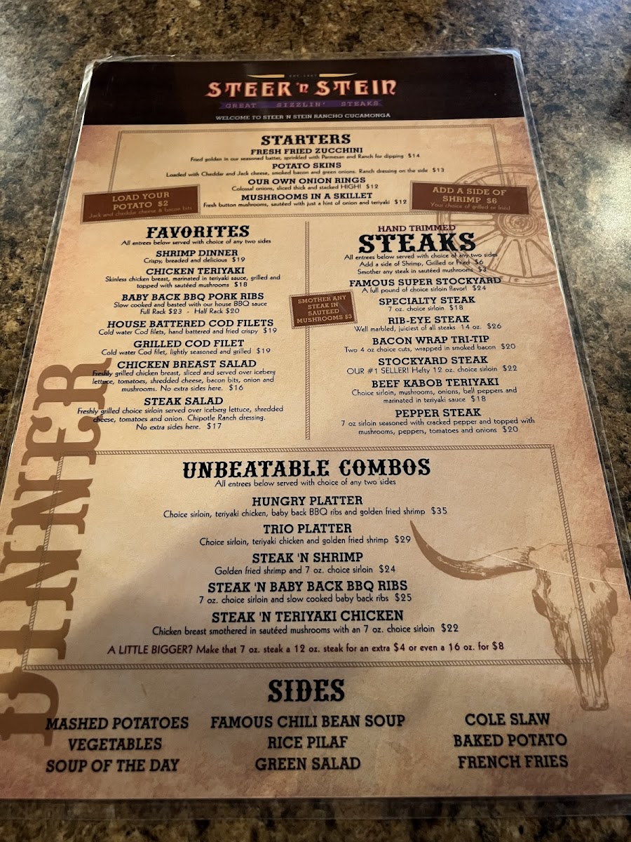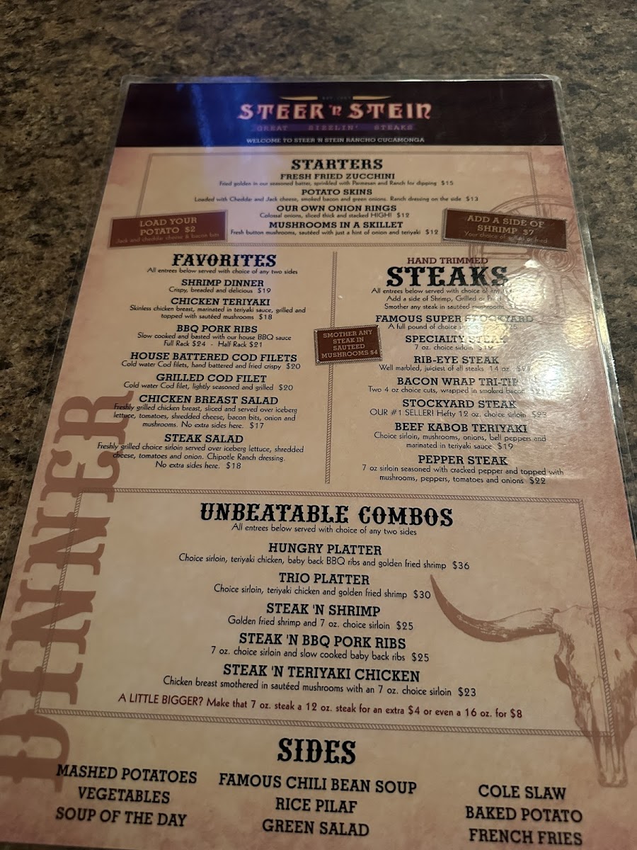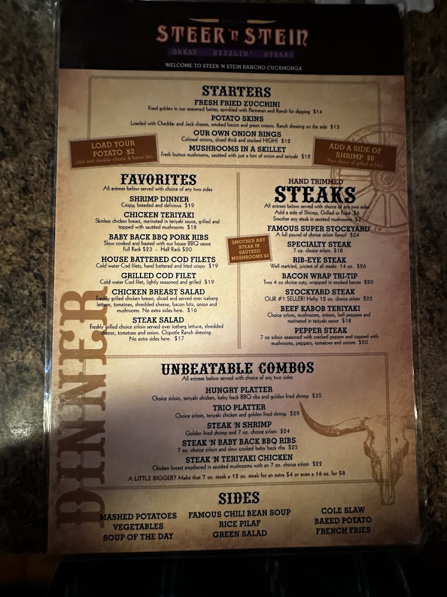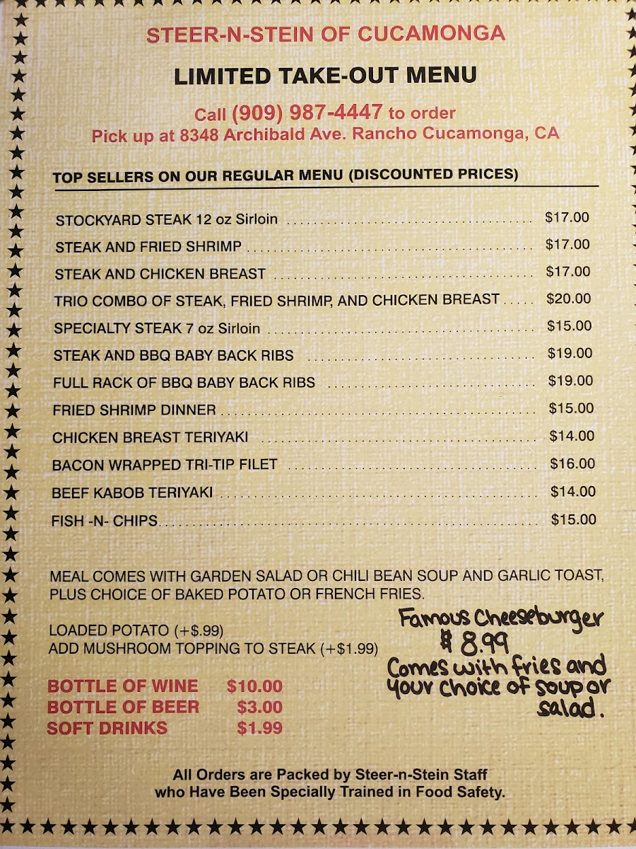Welcome to Steer N' Stein of Cucamonga, where the savory world of steak comes alive with every bite. Nestled at 8348 Archibald Ave in Rancho Cucamonga, this beloved steakhouse has cultivated a loyal following by serving hearty, comforting meals in a welcoming atmosphere. With a satisfying menu that boasts a variety of options, it's no wonder this eatery has become a staple among local food enthusiasts.
